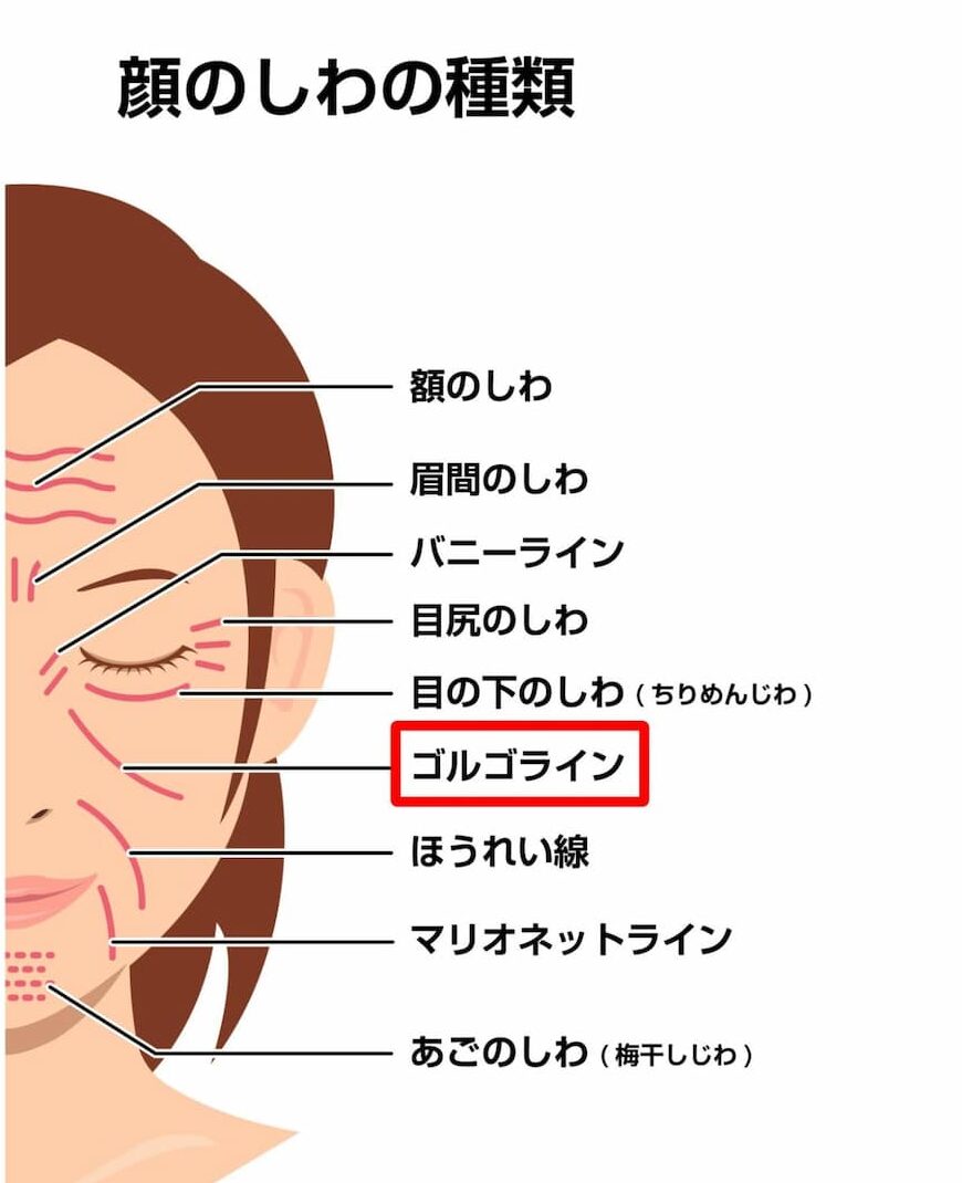 ゴルゴライン(ゴルゴ線)とは、目の下から頬に向かって斜めに走る線のことを指します。ゴルゴラインは頬の靭帯が皮膚を引っ張ることでできたくぼみです。