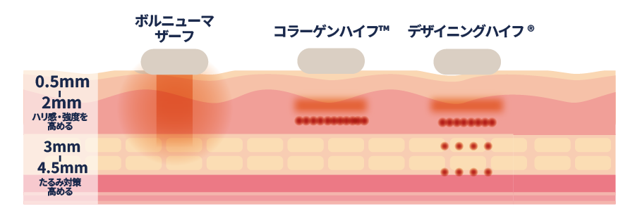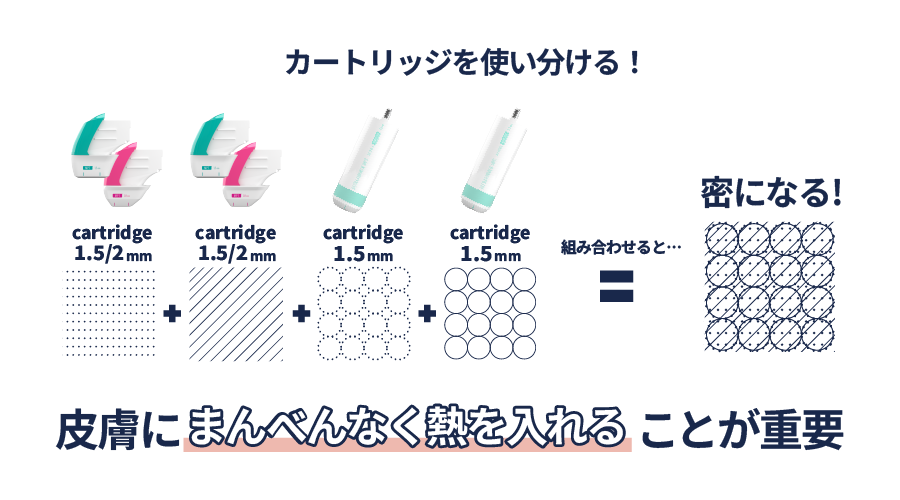 1.5 ミリと2ミリのカートリッジを使用し施術を行います。当院の従来のハイフのターゲットが筋膜、皮下組織、真皮層なのに対して脂肪より上層を狙っているのが特徴です。