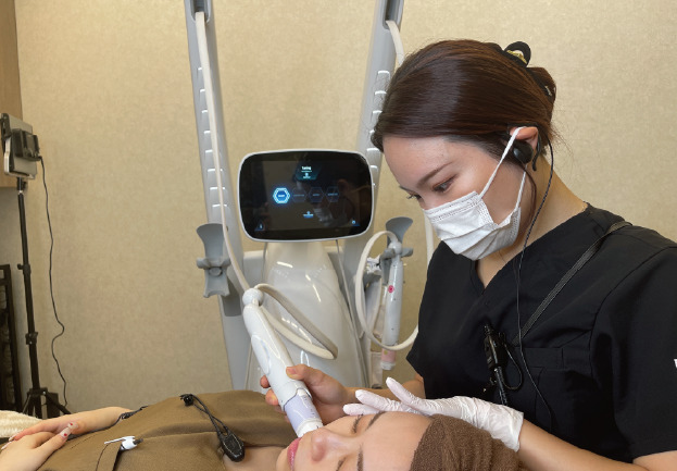 高密度超音波をドット状そして線状に真皮層に満遍なく熱を入れることにより浅層のタイトニング効果でハリ感、皮膚のたるみ改善が期待できるたるみ治療。