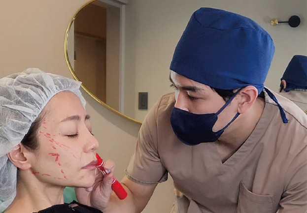 無理なくナチュラルに引き上がる軌道を設計。実際にお顔にマーキングを行います。