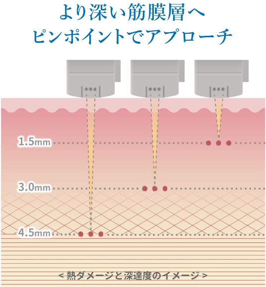 具体的な違いとしては、皮膚のどの層をターゲットにして熱エネルギーを照射するかという点です。サーマジェンとHIFUはそれぞれ作用する層が異なります。サーマジェンのターゲットは、真皮から皮下組織に対して高周波を照射し、HIFUのターゲットは、肌の奥深くにあるSMAS筋層です。肌を支える土台であるSMAS筋膜に作用するため、たるみのもとから引き上げます。