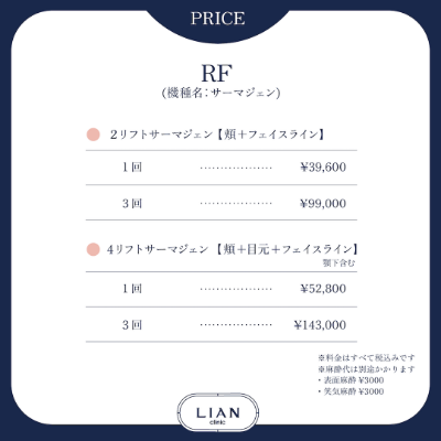 サーマジェンとよく比較される治療にサーマクール※がありますが、費用はサーマジェンの方がリーズナブルです。両者の費用を比較すると サーマジェンは1回40,000〜60,000円、サーマクールは80,000〜200,000円が相場です。