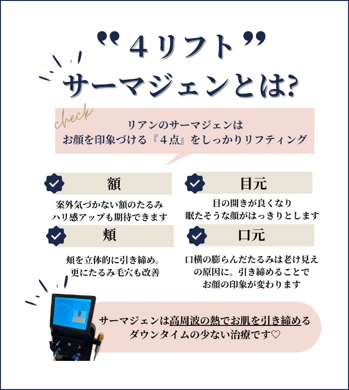 この4つのパーツに重点を置き、引き締めかつリフティングしていくのがリアンの【4リフトサーマジェン】です。