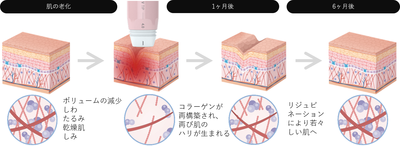 熱により体内のたんぱく質変性、脂肪の繊維を引き締め即時的に引き締め、その後中期経過としてコラーゲンやエラスチンを生成しハリのある肌へと導くための治療です。