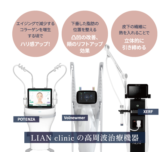 高周波を当てることで真皮層の線維芽細胞を刺激しコラーゲンやエラスチンの増生を行うことで弾力・ハリ感が改善し、脂肪をつつむ繊維性隔壁を収縮させ脂肪の下垂を改善