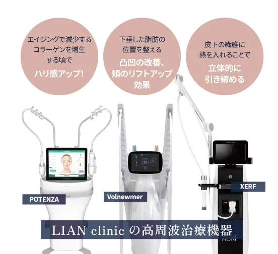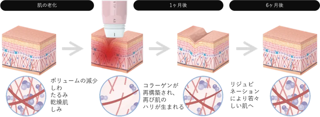 熱により体内のたんぱく質変性、脂肪の繊維を引き締め即時的に引き締め、その後中期経過としてコラーゲンやエラスチンを生成しハリのある肌へと導くための治療です。