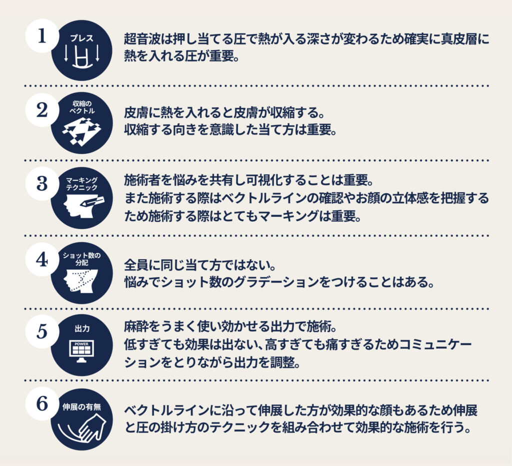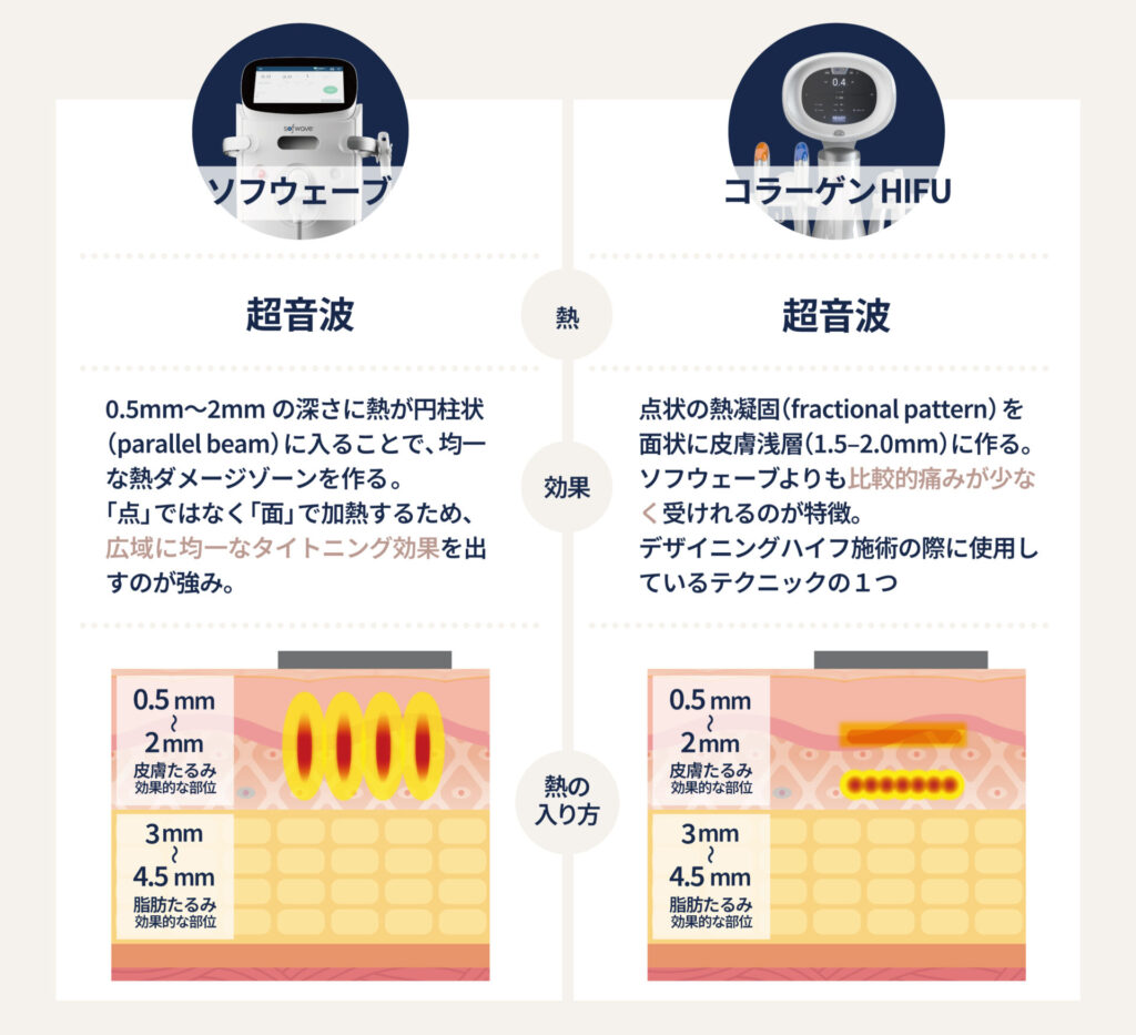 【ソフウェーブの特徴はスパーブという加熱方法】・円柱上のボリュームのある超音波で、0.5-2.0mmと縦に大きい・60-70度を最大5秒とタイトニングに最適な加熱が可能